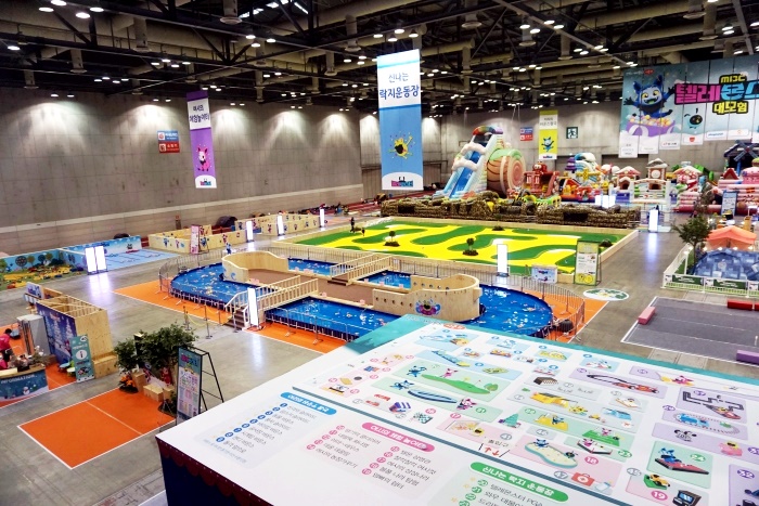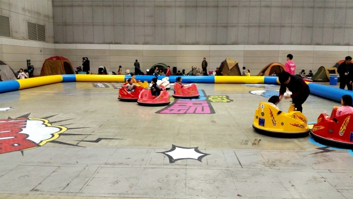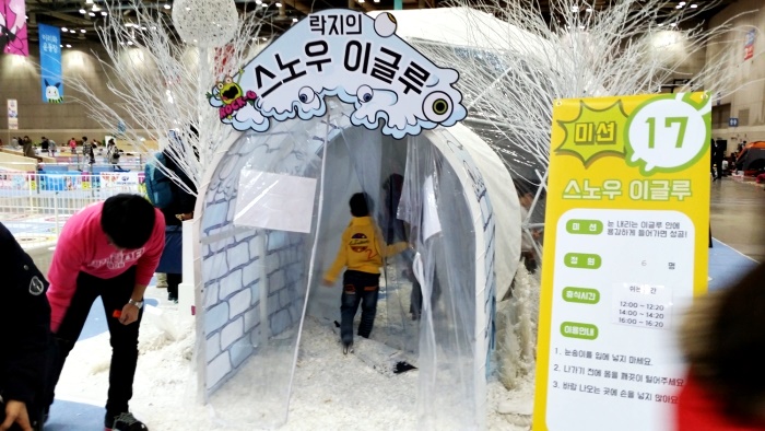 여기도 비비에서 운영하는 킨텍스 실내놀이공원입니다. 다 비슷비슷해서 무슨 차이인지는 모르겠지만, 여기는 이름부터가 썰매가 들어가기 때문에 썰매가 특징인 것 같네요. 아, 혹시 모르시는 분들을 위해 설명하자면, 여기 각각의 실내놀이공원이 모두 다 다른 장소 있고, 각각 들어가려면 입장료도 따로 내야 됩니다. 같은 장소가 아닙니다. 비비가 운영하는 곳은 두 개씩 패키지로 묶여서 조금 저렴하게 두 군데를 이용할 수 있긴 합니다. 워낙 넓어서 한 군데서도 다 못 놀 것 같은데 두 군데 이용해서 5-6시간씩 논다는 아이들이 있더군요. 체력이 정말 좋네요. 참고로 여기는 개인용 텐트나 돗자리를 가져갈 수 있습니다. 설치할 수 있는 공간이 있는데, 거기에 텐트나 돗자리를 깔고 쉴 수 있도록 배려했습니다. 그리고 간단한 음식을 먹을 수 있는 분식 위주의 음식점도 있습니다.