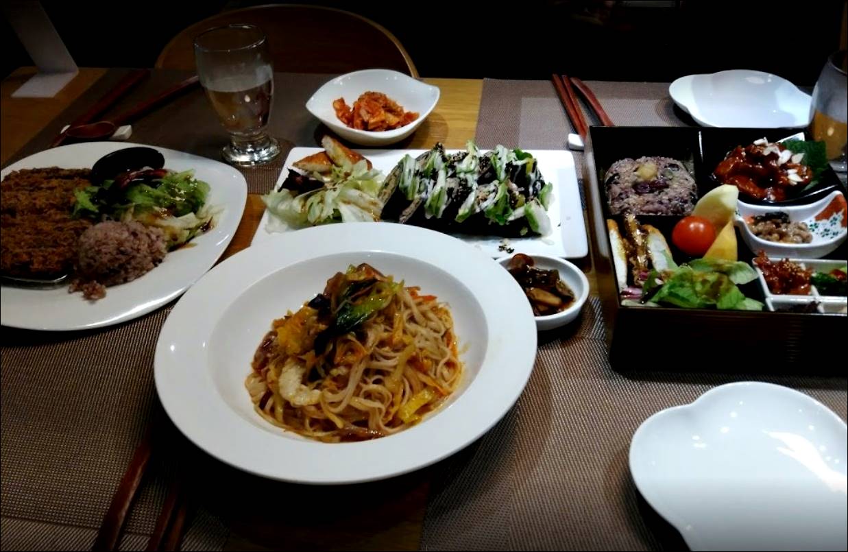 음식 비주얼을 보면 여느 음식과 다른 게 없어 보이지만, 사실 여기있는 모든 음식이 다 채식입니다. 돈까스도 속이 콩고기로 되어 있습니다. 음식점 이름인 베지나랑은 베지(채소)+나랑(깨달음)이란 뜻입니다.