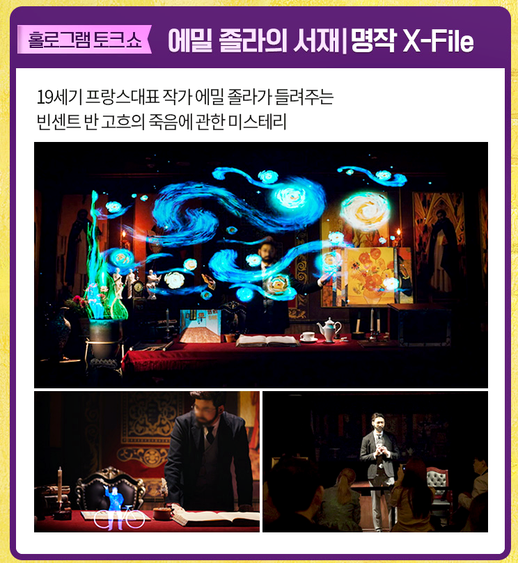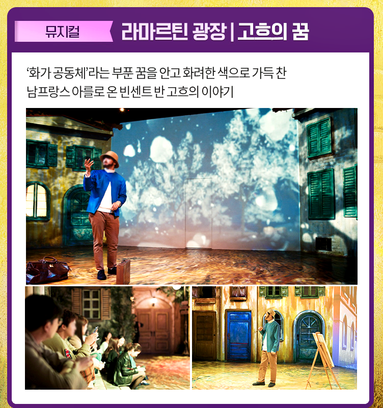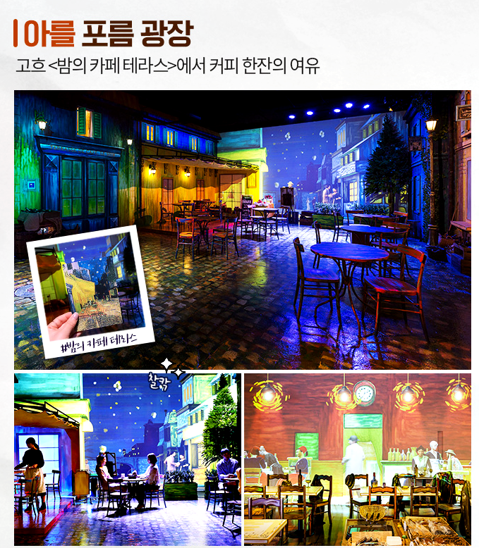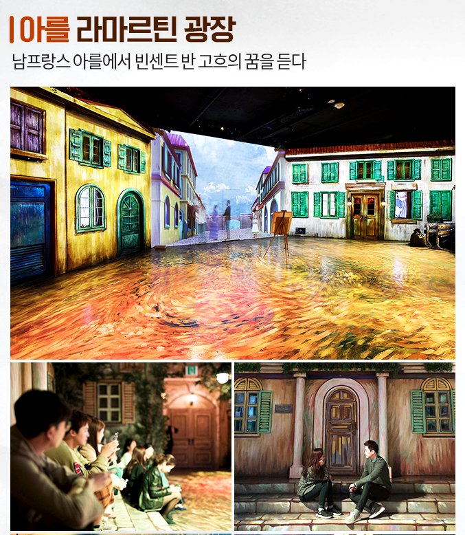 위 작품 중에서 아를 포름 광장을 보면 사실 의자들이 작품 안에 있거든요. 그런데 배경만 뒷 배경으로 남아있고, 의자는 밖으로 나왔습니다. 거기에 관람객들이 앉아서 사진을 찍게 되면 내가 작품의 주인공이 되는 거죠. 특히 프랑스 작품들 위주로 전시를 해놔서 전시관을 돌아다니다 보면 프랑스에 와있는듯한 착각을 불러 일으킵니다.