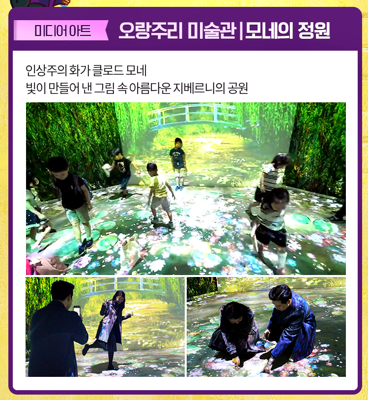 "33개월 아기와 함께 다녀왔는데요. 직원들 너무 친절하고 미술관하고 친해지기 너무 좋았네요. 뮤지컬과 모네영상도 좋았어요. 컬리링 체험도 좋았습니다."