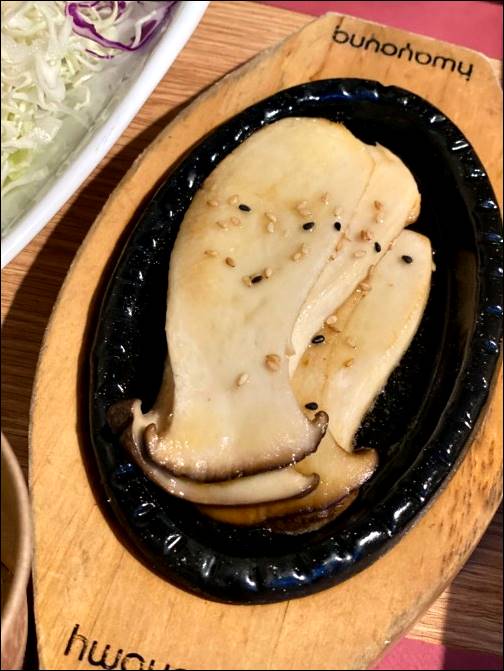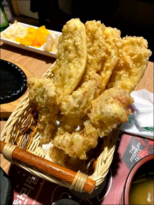 참치회 무한리필인데, 메뉴가 순서대로 나옵니다. 처음에는 에피타이저로 참치죽, 참치강정, 샐러드, 오징어롤, 장국, 버섯 볶음이 나오고, 그 다음에 무한으로 리필해서 먹을 수 있는 참치가 나옵니다. 마음껏 리필해서 먹고 나면 메인참치가 나오는데 이 때는 탕과 구이가 제공이 됩니다. 마지막은 튀김과 식사류를 먹게 됩니다. 굉장히 알찬 구성입니다.