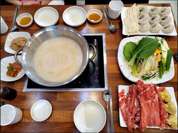 진하고 깔끔한 고기육수, 시원하고 달큰한 야채가 잘 어우러집니다. 샤브샤브 느낌이 나는 만두전골입니다.