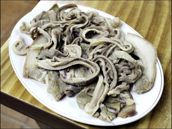 순대가 곱창으로 되어 있고, 속은 피순대입니다. 평소에 내장요리를 좋아하시는 분들은 아주 좋아할 맛입니다. 살짝 돼지냄새가 나서 이런 음식 싫어하는 분들은 먹기 힘들 수 있습니다.