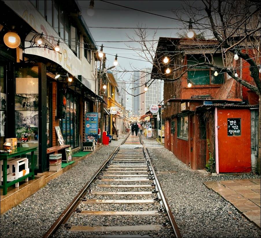 다음으로 소개할 군산 여행은 경암동철길마을입니다. 군산에서 인기가 많은 관광지 중 하나죠. 철길이 있는데, 그 양 옆으로 건물들이 바짝 붙어있는 이 풍경이 신선해서, 많은 사람들이 찾고 있습니다.