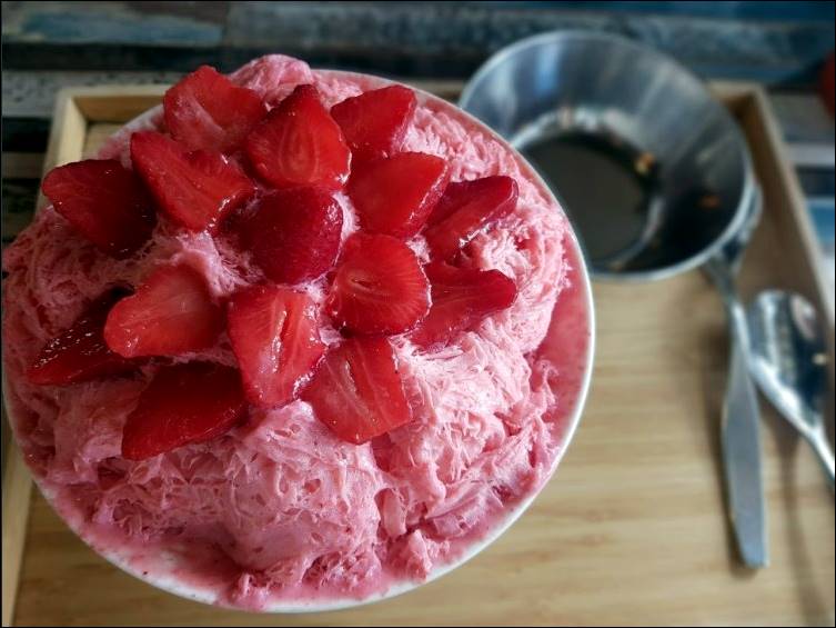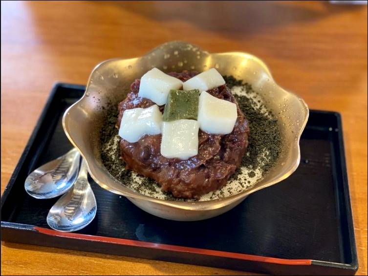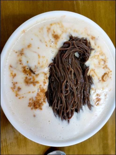 기존에 먹던 팥빙수하고는 완전히 다른데요. 전주에 딱 어울리는 팥빙수입니다. 떡도 그렇고, 흑임자도 그렇고, 한국 전통의 미를 잘 살렸습니다. 흑임자 팥빙수가 아주 달지 않고 고소한 맛이 나면서 맛있습니다. 특히 위에 올려져 있는 떡이 부드럽고 쫀득합니다.