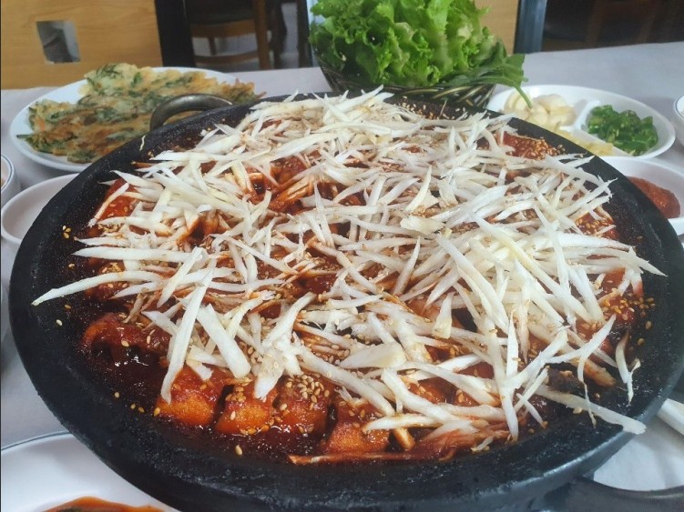 고추장양념이 들어간 장어 위에 새하얀 더덕이 눈처럼 쌓여있는데, 치즈를 뿌려놓은 것 같은 비주얼입니다. 매콤한 양념의 장어와, 더덕이 씹히는 식감까지 더해져서 맛이 좋습니다. 물론 장어와 더덕의 조합이니 건강에도 좋겠죠.