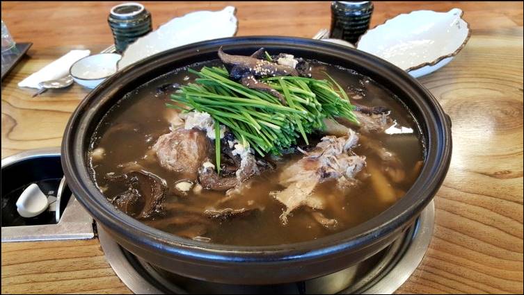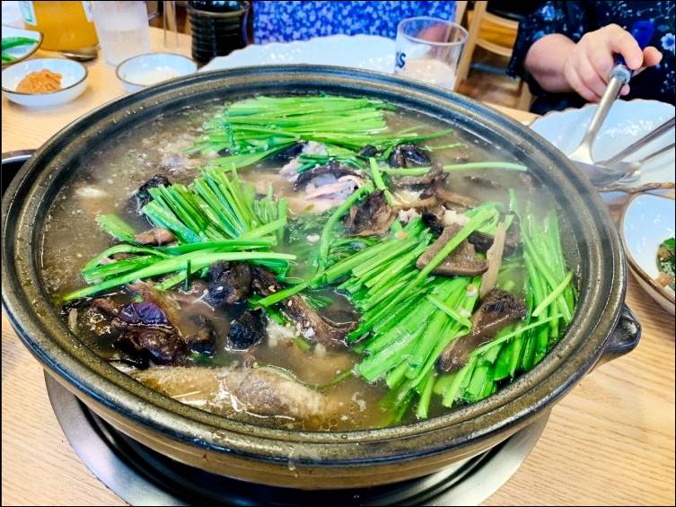 오리백숙 안에 한약재를 넣었는지, 국물맛이 시원하고 건강한 맛이 납니다. 안에 들어있는 능이버섯의 쫄깃한 식감도 좋습니다. 진한 국물과 함께 먹는 오리고기도 맛있습니다.