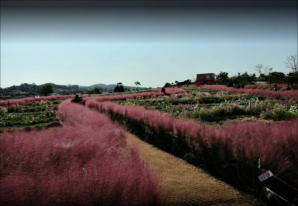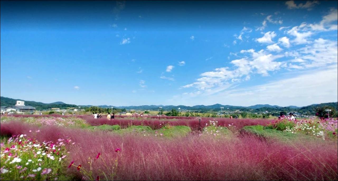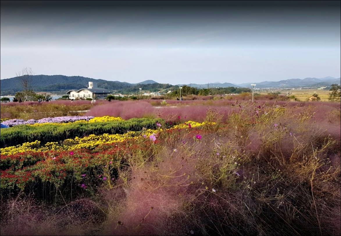 다음으로 소개할 전남 함평 가볼만한곳 베스트10은 억새밸리존입니다. 억새밸리존은 주포지구 한옥전원마을 근처에 있어서, 함께 구경하면 좋은데요. 가을에 인기가 많은 핑크뮬리가 많이 심겨져 있습니다. 곳곳에 코스모스, 국화도 함께 볼 수 있습니다.