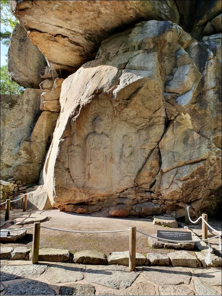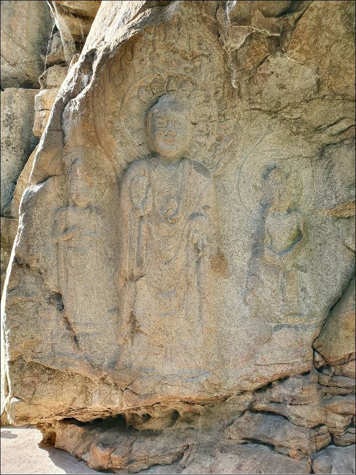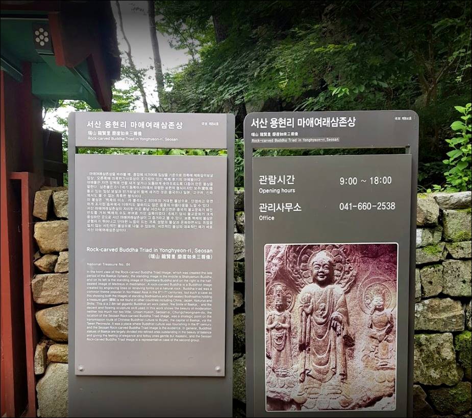 다음으로 소개할 충남 서산 가볼만한곳 베스트10은 서산용현리마애여래삼존상입니다. 서기 600년경에 제작된 국내에서 가장 뛰어난 백제 후기의 작품으로 보는 각도에 따라 웃는 모습이 달라져서 입체감을 느끼게 하며 생동감을 주는 석상입니다. 아침 햇빛에 비춘 얼굴이 가장 아릅답다고 하네요.