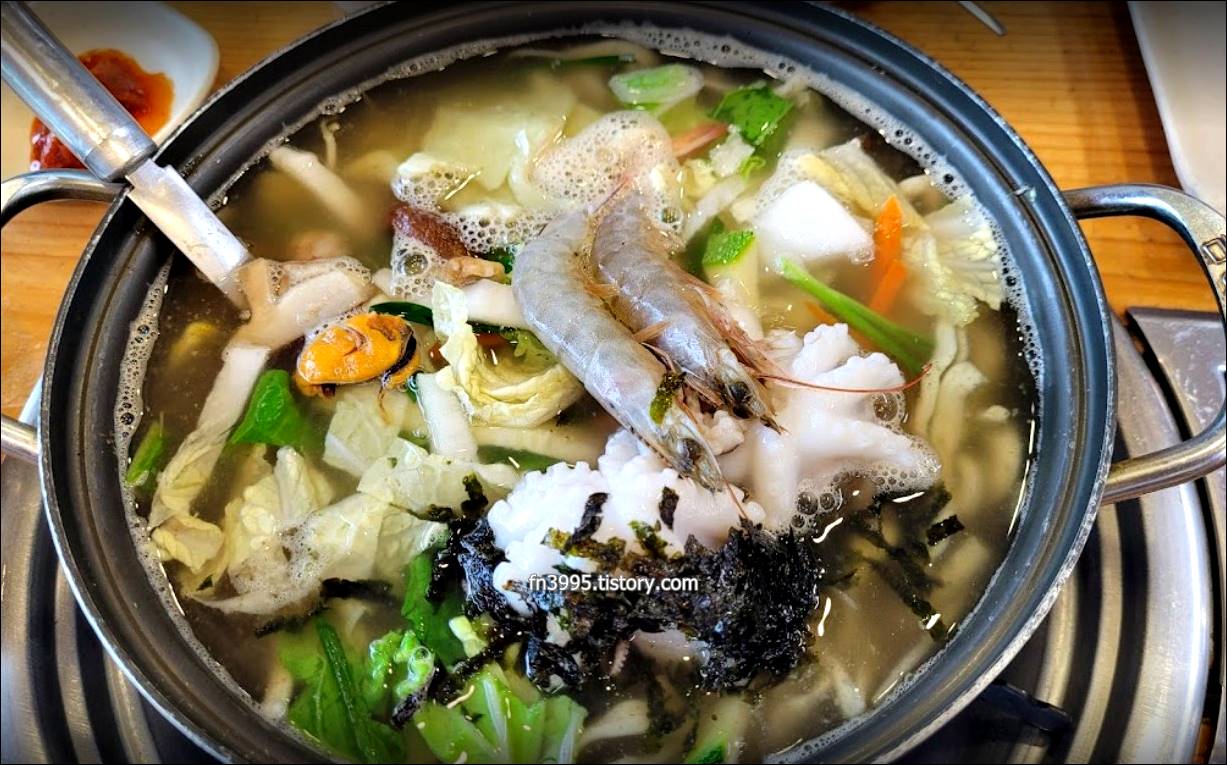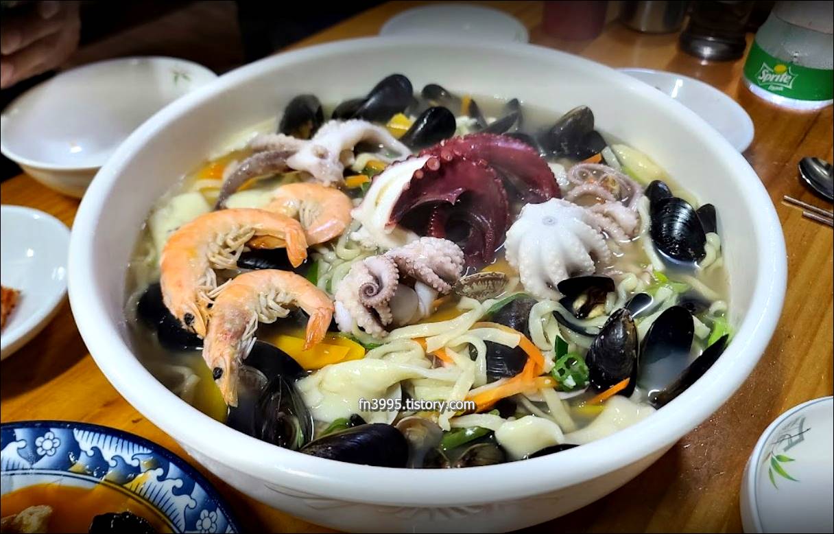 칼국수에 쭈꾸미, 홍합, 새우 등이 들어가서 국물이 맛있습니다. 담백하고 칼칼한 맛입니다. 겉절이 김치와 같이 먹으면 더 좋습니다.