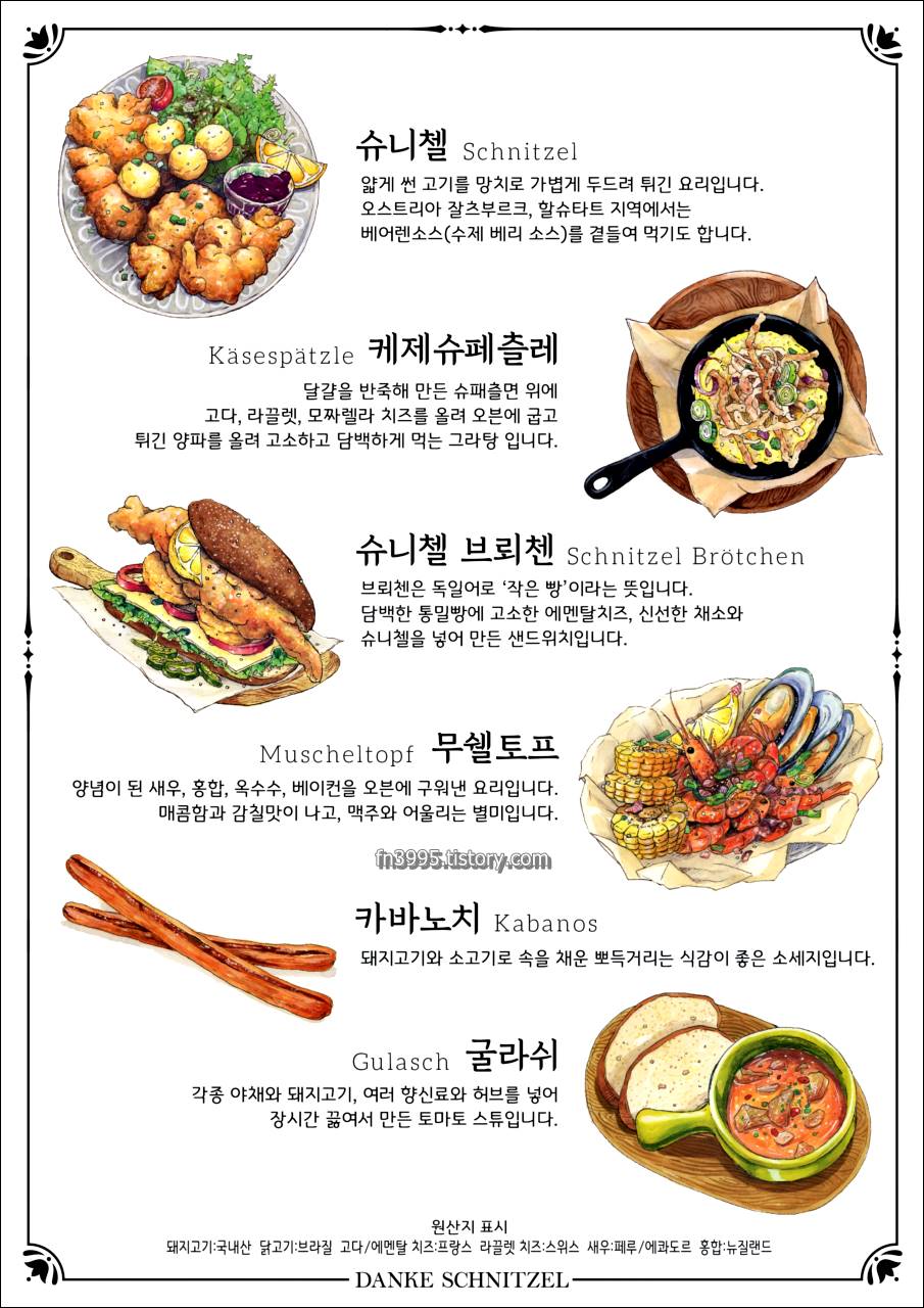 독일식인데도 한국인 입맛에 잘 맞습니다. 특히 맥주와 함께 먹으면 딱 좋습니다. 슈니첼은 얇은 돈까스 같은 느낌인데 부드러워서 맛이 좋습니다. 전체적으로 양도 적지 않고, 배부르게 먹을 수 있습니다. 내부 인테리어도 그렇고, 음식도 그렇고 유럽에 와있는듯한 느낌이 듭니다.