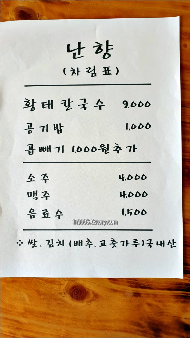다음으로 소개할 남해 맛집 추천은 난향입니다. 여기는 황태칼국수 전문점입니다. 다랭이 마을과 보리암 사이에 위치해 있습니다. 예전에는 해장국도 판매를 했었는데, 지금은 메뉴가 황태칼국수 밖에 없습니다. 음식점 안에 테이블이 많지 않고, 주차장도 4~5대 정도의 공간만 있습니다. 좁기도 하고, 인기가 많아서 대기가 좀 있습니다.