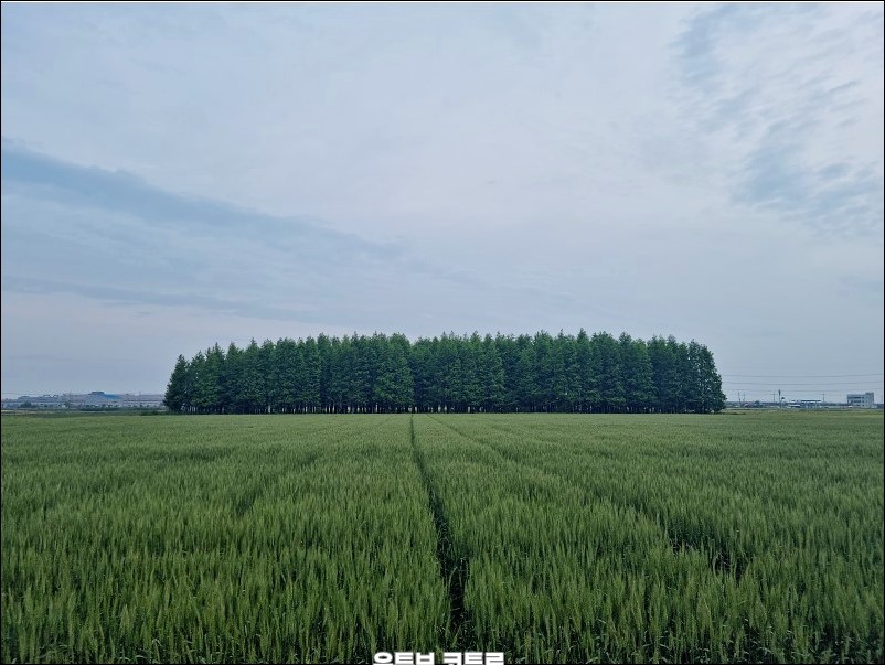 초록의 청보리밭이 드넓게 펼쳐진 가운데 메타세쿼이아 군락이 포인트로 자리 잡고 있습니다.