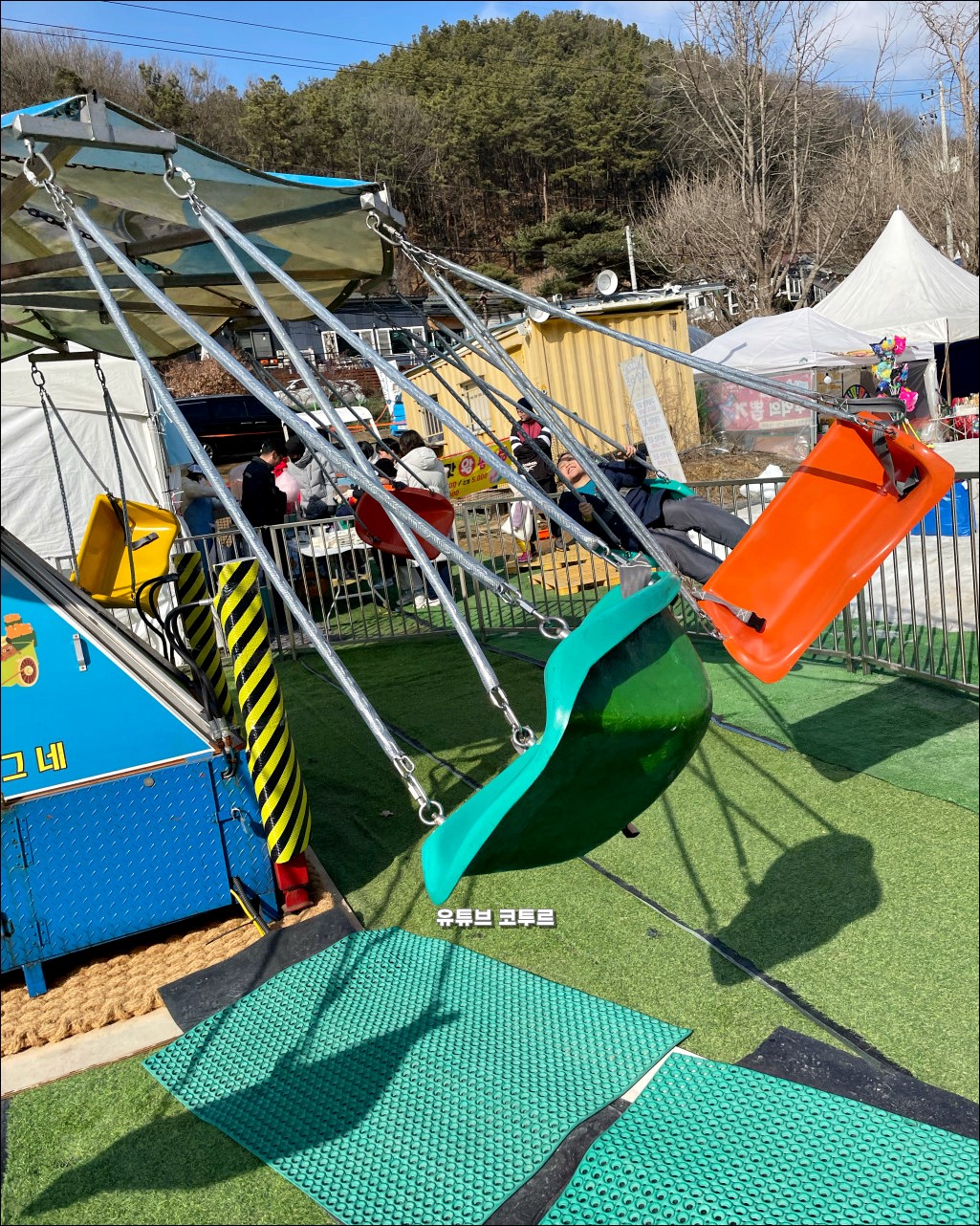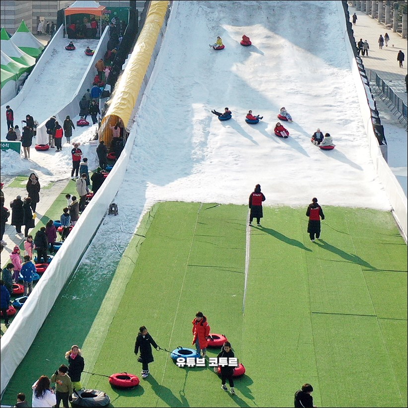 양주눈꽃축제 눈썰매장입니다. 양주눈꽃축제는 양주 장흥자연휴양림 내 송추 아트밸리 일대에서 열리는 겨울축제입니다. 길이 200m 초대형 슬로프가 있습니다. 여기에 최대 10명까지 튜브를 연결해서 동시에 내려오는 줄줄이 썰매가 인기가 많습니다. 일반 눈꽃썰매, 유아전용 썰매 등도 있습니다. 축제장 곳곳에 500여 점의 조각 작품이 전시되어 있어 전시도 같이 보면 좋습니다. 네이버 예매가 평일 기준 성인 만 3천원, 주말 만 6천원이고 오전 10시부터 오후 5시까지 운영을 합니다.