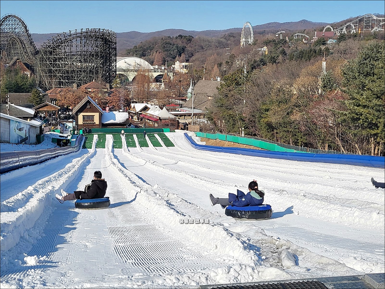 에버랜드 스노우버스터입니다. 최대 4인까지 같이 내려오는 200m 슬로프인 익스프레스 코스, 속도 대결을 펼치는 레이싱 코스, 패밀리코스가 있습니다. 튜브 리트프가 있어서 편하게 올라갈 수 있습니다. 이용요금은 에버랜드 자유이용권에 포함되어 있습니다.