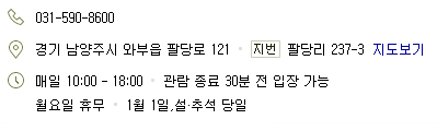 남양주시립박물관은 남양주를 대표하는 박물관이라고 할 수 있는데요, 남양주 와부에 위치해 있습니다. 과거에는 남양주 역사박물관으로 이름이 불렸는데, 최근에 시립 박물관으로 바뀌었습니다. 2010년 남양주의 역사와 문화를 보존하고 전시하기 위해 개관을 했고, 남양주시에서 출토된 여러 유물들과 남양주 지역의 역사에 대해서 전시를 통해 배울 수 있습니다. 기획전시실에서는 매년 새로운 테마를 가지고 전시를 선보이고 있습니다.