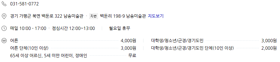 가평군 북면에 위치한 남송미술관입니다. 남송미술관의 남궁원 관장은 오랫동안 수집하고 관리했던 미적 가치가 있는 예술품들을 남송미술관에 꾸준히 전시해 왔습니다. 남송미술관이 독특한 게 건물이 전통한옥 모양으로 생겼습니다. 전시공간으로는 1,2층 대형 전시실이 있고, 3층에는 체험학습 공간이 있습니다.