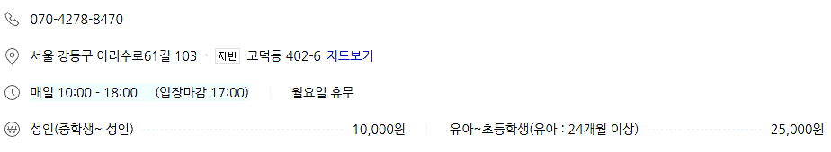 여기까지 강동구 실내 가볼만한 곳이었습니다. 다음에는 미리 예고해 드린대로 송파(잠실) 실내 가볼만한 곳 소개하도록 하겠습니다.