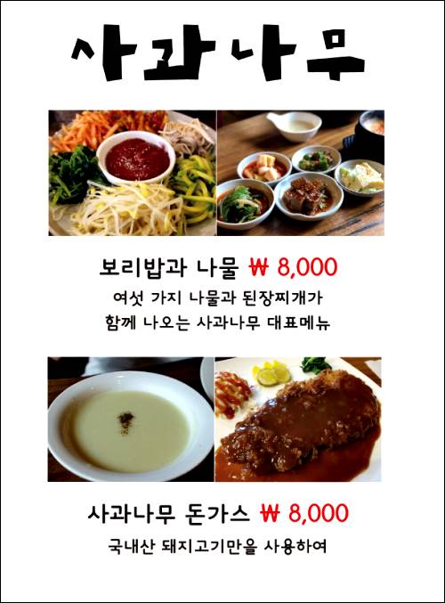 여기는 메뉴가 굉장히 간단합니다. 보리밥과 나물이 있고, 사과나무 돈가스가 있습니다. 그 외에는 전, 무침이 있고, 음료가 있습니다. 보리밥과 나물은 큰 대접에 보리밥과 나물을 같이 비벼서 먹는 형태인데, 맛이 깔끔하고 좋습니다. 그리고 같이 나오는 된장찌개도 잘 어울리는 맛입니다.
